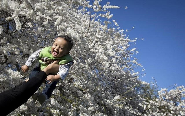 A father holds up his son for a photo in front of a cherry tree in