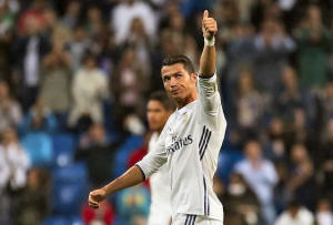 Real Madrid's Cristiano Ronaldo reacts at the end of the match.