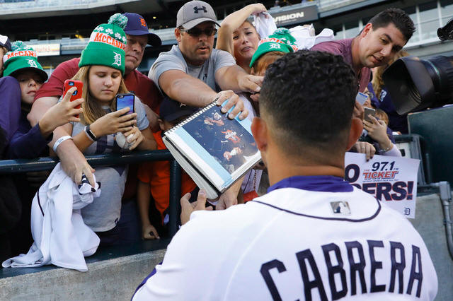 Tigers first baseman Miguel Cabrera (24) signs autographs prior to