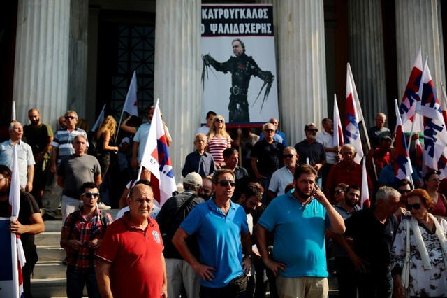 reads "Katrougalos Scissorhands". REUTERS/Alkis Konstantinidis
