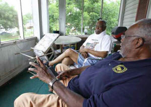 Louis Brooks (L), talks with Henry Wilder with the Thomaston-Upson
