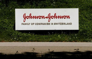 The logo of healthcare company Johnson & Johnson is seen in front of