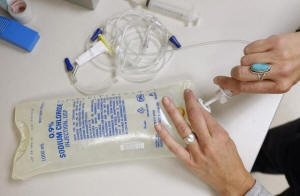 A nurse prepares a bag of saline at Intermountain Healthcare's Utah