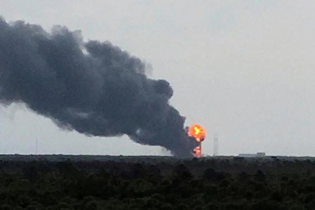 An explosion on the launch site of a SpaceX Falcon 9 rocket is shown