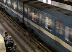 FILE PHOTO - Polices officers watch a train pass in a subway station