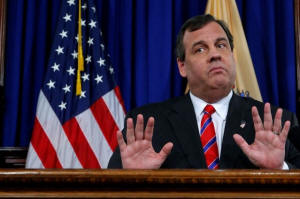 New Jersey Governor Chris Christie reacts to a question during a