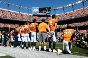 kneeling football players, raised fists, in anthem protests