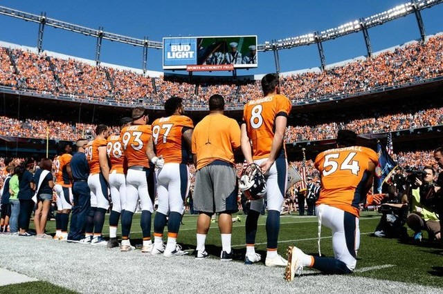 linebacker Brandon Marshall (54) kneels during the National Anthem