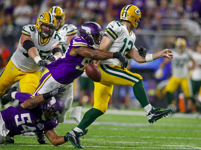 Vikings defensive end Danielle Hunter (99) sacks Green Bay Packers