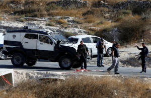 Israeli security forces stand at the scene where a Palestinian