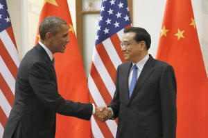 President Barack Obama (L) shakes hands with Chinese Premier Li