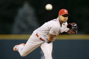 Cardinals starting pitcher Carlos Martinez (18) delivers a pitch in