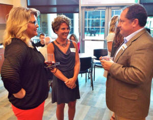 Kristi Powell, site administrator for Heartland College (center) and Tom McLaughlin of Lincoln College visit. Both colleges are sponsors.