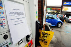 Out of fuel signs are pictured on gas pumps at a Twice Daily Shell