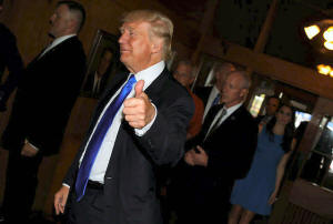 Republican presidential nominee Donald Trump gives a thumbs-up as he