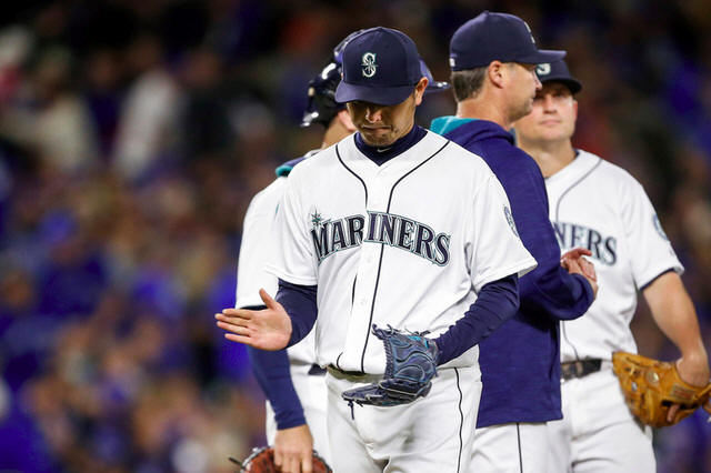 Mariners starting pitcher Hisashi Iwakuma (18) walks back to the