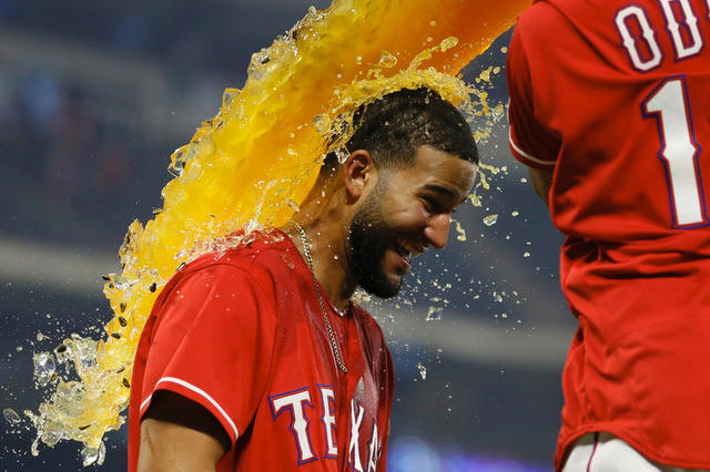 Rangers right fielder Nomar Mazara (30) is dunked with Powerade by