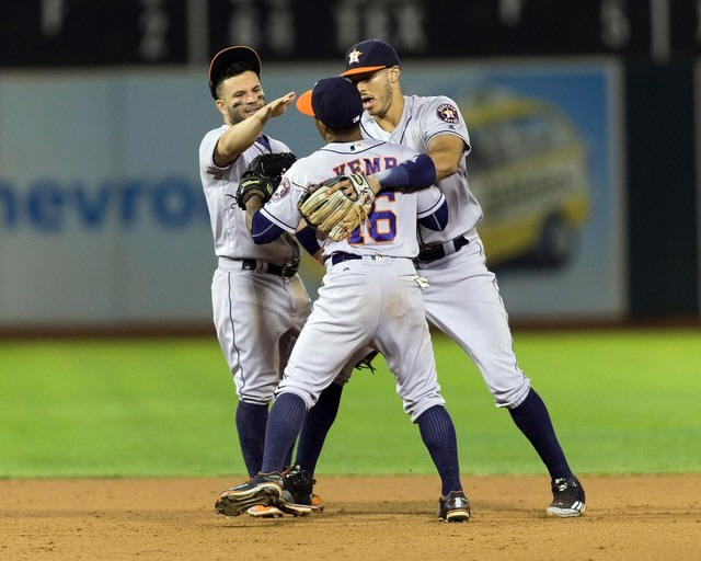 Astros second baseman Jose Altuve (27) left fielder Tony Kemp (16)