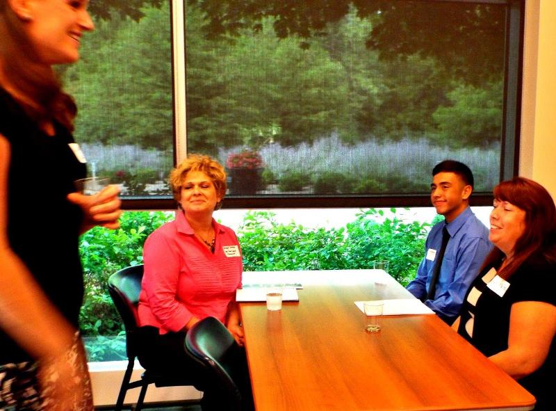 Bridget Schneider with Level 4 Advisory Services visits with a new student and his mom.