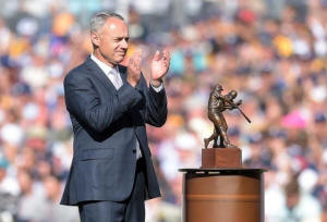 MLB commissioner Rob Manfred on the field with the batting trophy