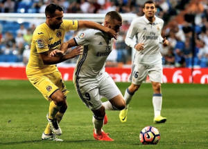 Real Madrid's Karim Benzema and Villarreal's Mario Gaspar in action.