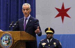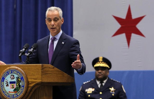 Chicago Mayor Rahm Emanuel delivers his speech on the city's surge
