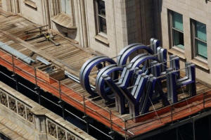 A Yahoo logo is seen on top of the building where they have offices
