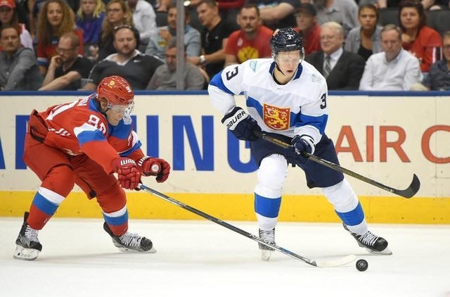 Team Finland defenceman Olli Maatta (3) skates with the puck past a