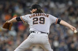 Giants starting pitcher Jeff Samardzija (29) pitches during the