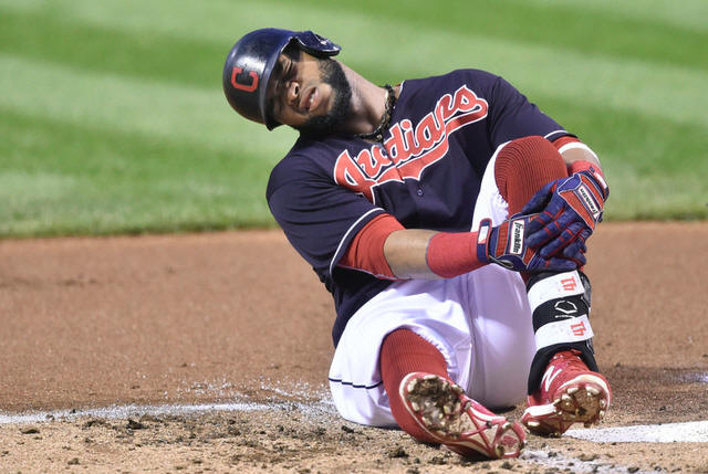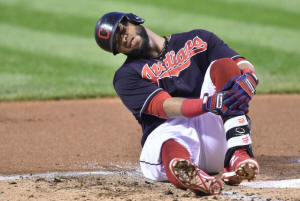 Indians first baseman Carlos Santana (41) reacts after fouling a
