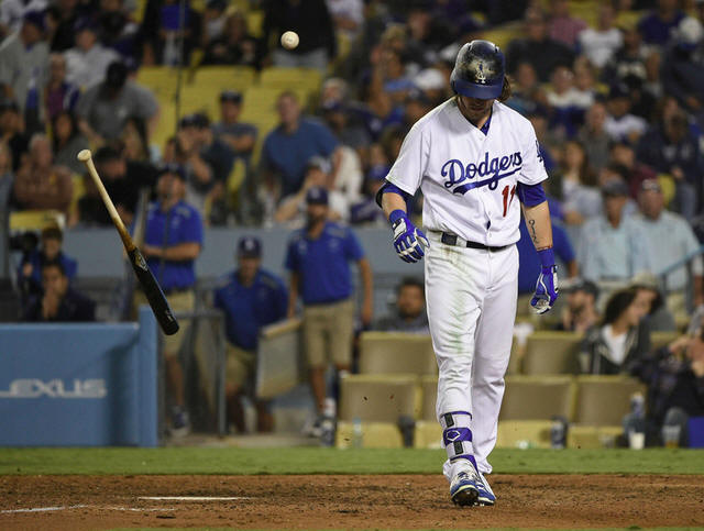 Dodgers right fielder Josh Reddick (11) reacts after striking out