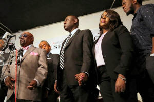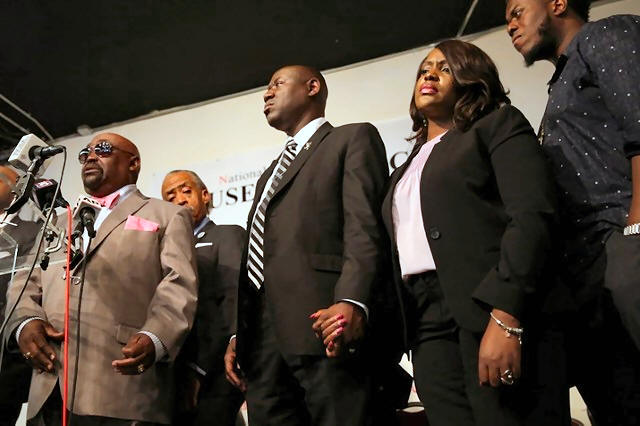 Sharpton, attorney Benjamin Crump and Tiffany Crutcher stand during