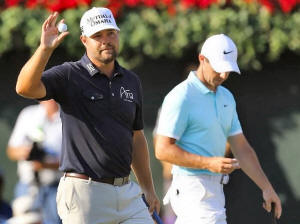 Ryan Moore reacts after putting the eighteenth as Rory McIlroy