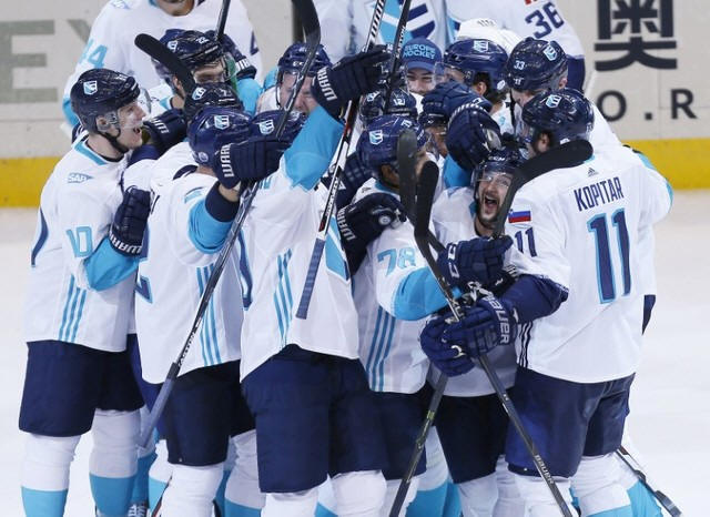 Team Europe celebrates a win over Team Sweden after an overtime gal