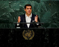 Greek Prime Minister Alexis Tsipras addresses the United Nations General Assembly in the Manhattan borough of New York, U.S., September 22, 2016. REUTERS/Eduardo Munoz