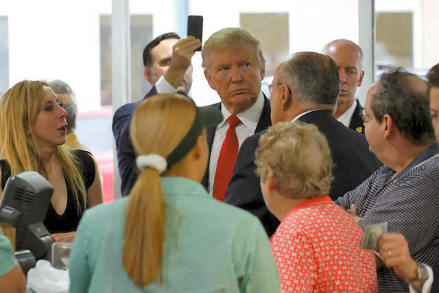 Republican presidential nominee Donald Trump greets people at the