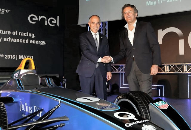 hand with Alejandro Agag (R), Formula E CEO, during a news