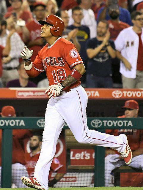 Angels first baseman Jefry Marte (19) celebrates after hitting a