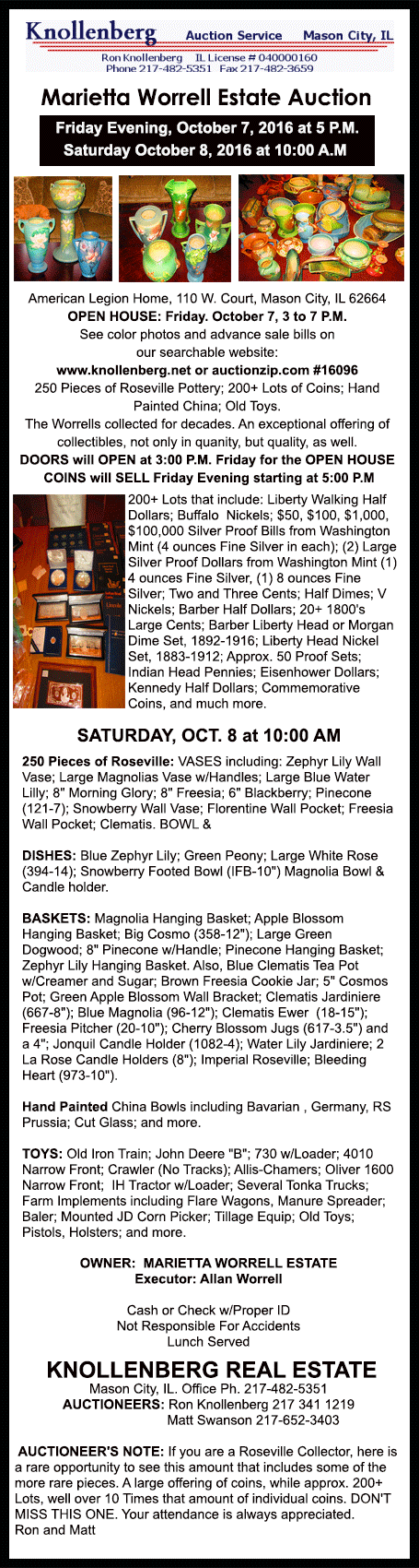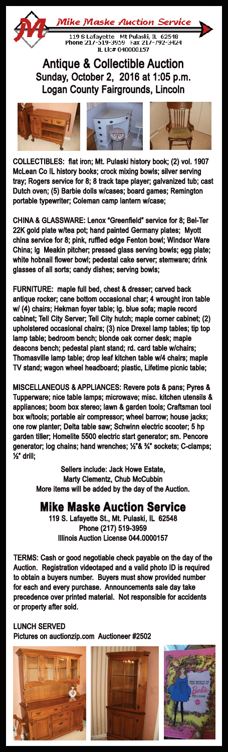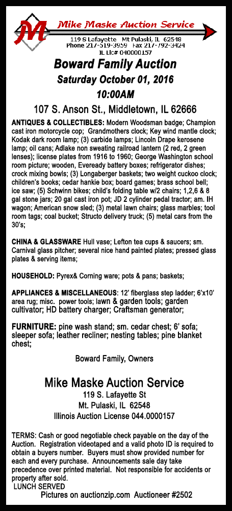 Click on Maske Auction Service ad for sale bills and listings of auctions and goods.