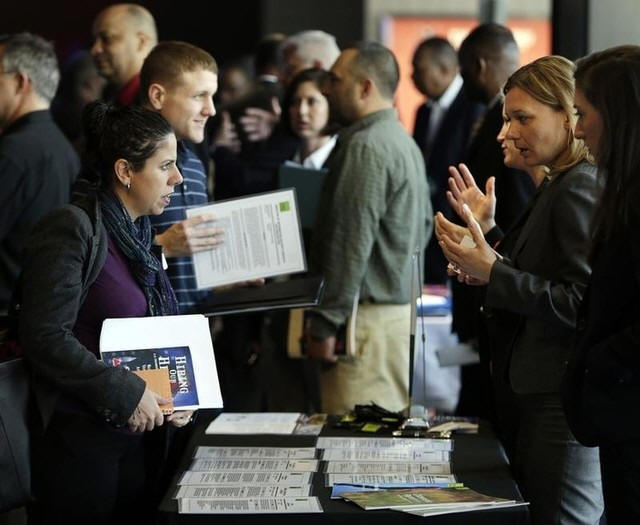 Legal firm Hogan Lovells representative Nina LeClair (2nd R) talks to U.S. military veteran applicants (L) at a hiring fair for veteran job seekers and military spouses at the Verizon Center in Washington April 9, 2014. REUTERS/Gary Cameron