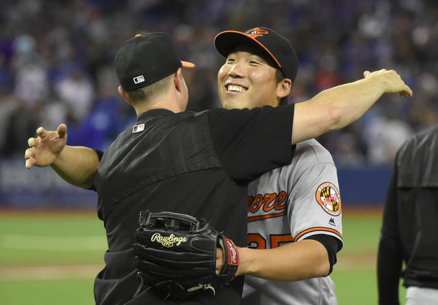 Orioles left fielder Hyun Soo Kim (25) is embraced by a team mate as