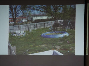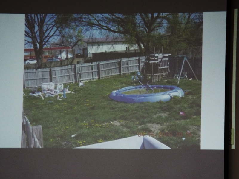 photos of the back yard and deck area, pointing out a kiddie pool of