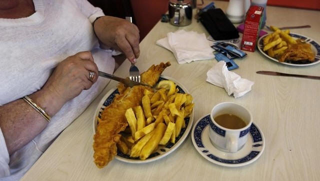 File phot of a woman eating fish and chips at Jack's Fish & Chips in