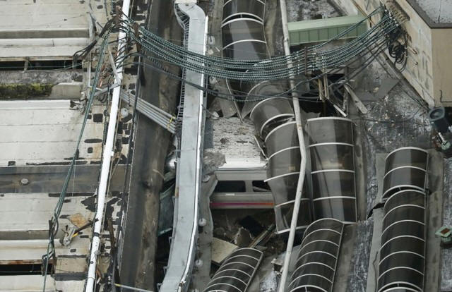 A derailed New Jersey Transit train is seen under a collapsed roof