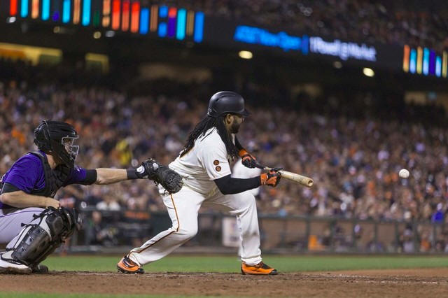 Giants starting pitcher Johnny Cueto (47) singles on a bunt ground