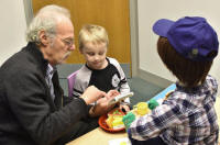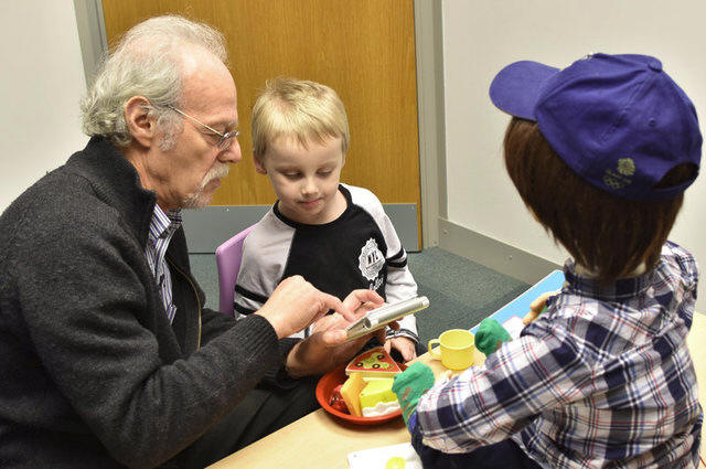 mediates while Harrison, 5, who is autistic, plays with Kaspar,