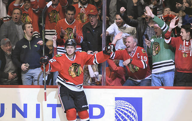 Artemi Panarin (72) celebrates after he scores a goal during the