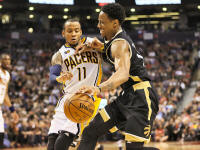 Raptors guard DeMar DeRozan (10) and Indiana Pacers guard Monta