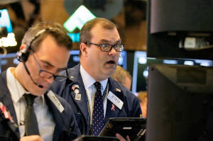 Traders work on the floor of the New York Stock Exchange in the