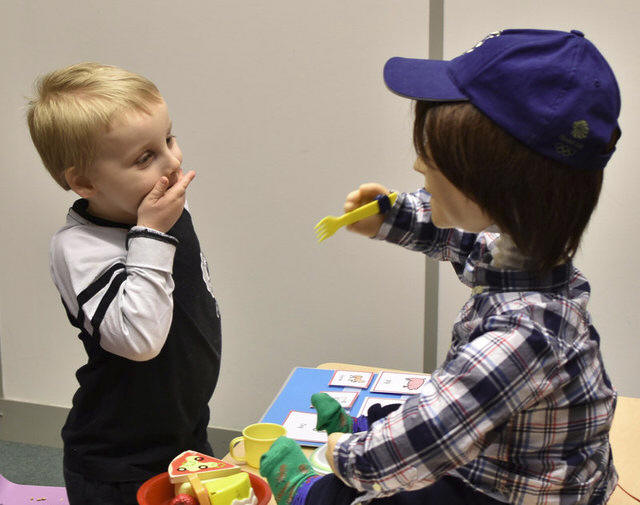 Harrison, 5, who is autistic, plays with Kaspar, a child-sized